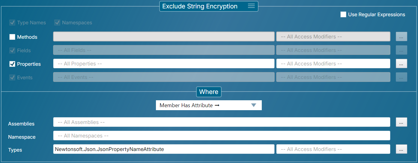 - The Use Regular Expressions option allows the typed values (e.g., method or property names) to be interpreted as regex patterns.