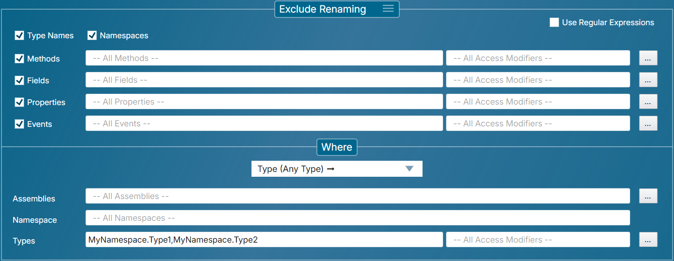 - Regular Expressions: Use them with caution—overly broad patterns can accidentally match more types/members than you intended.