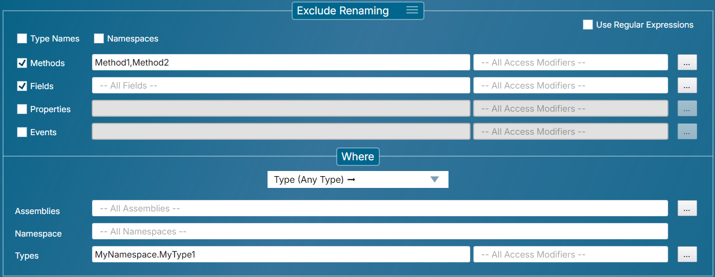 Fields and methods Method1/Method2 in MyNamespace.MyType1 are excluded from renaming. The type name itself, properties, and events in MyType1 remain subject to renaming.
