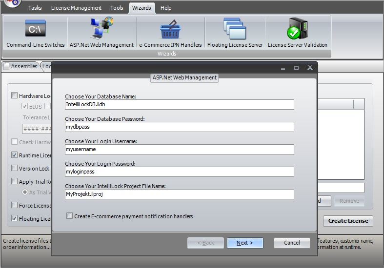 Open your IntelliLock project file (the one you use to protect your application) and click the menu item Wizards > ASP.Net Web Management to create the required server files.